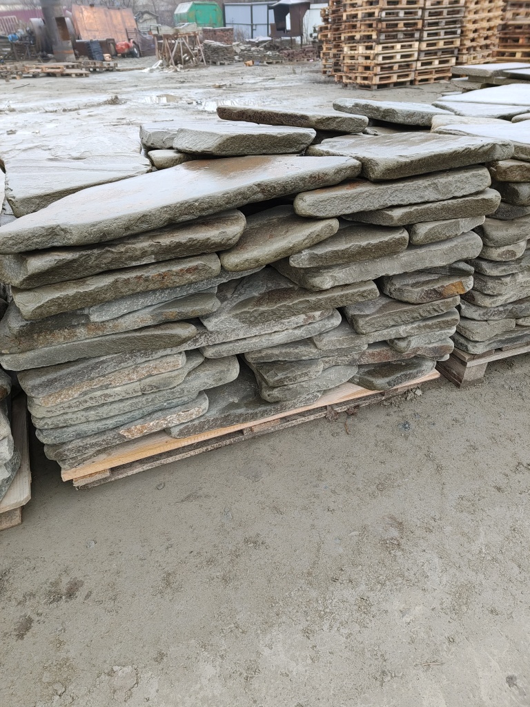 Галтованный серо-зелёный песчаник для мощения дорожек, пешеходных зон, тротуаров на землю, грунт, песчано-щебёночную подушку.